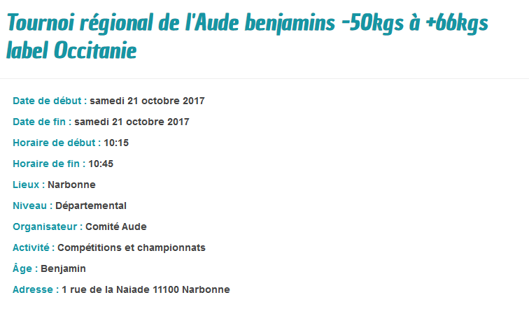 « Tous les Évènements Cet évènement est passé. Tournoi régional de l’Aude benjamins -50kgs à +66kgs label Occitanie 21 octobre 2017 -8 h 00 min - 17 h 00 min « Tournoi régional de l’Aude benjamins – 30kgs à -46kgs label Occitanie Tournoi régional de l’Aude benjamines label Occitanie » Ajouter au calendrier Google Agenda iCalendar Outlook 365 Outlook Live Détails Date : 21 octobre 2017 Heure : 8 h 00 min - 17 h 00 min Catégories d’Évènement: Benjamins, Championnat, Tournoi Officiel Lieu Dojo de Narbonne Quartier St Jean - St Pierre Narbonne, 11000 + Google Map